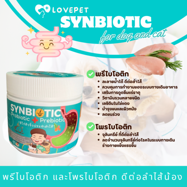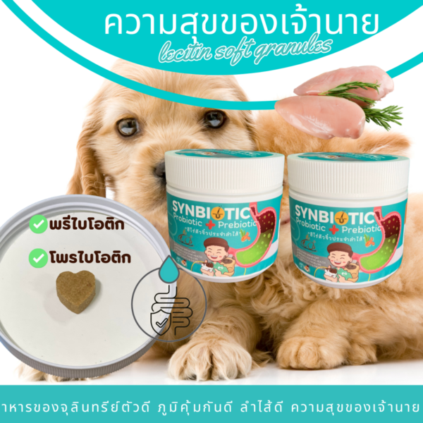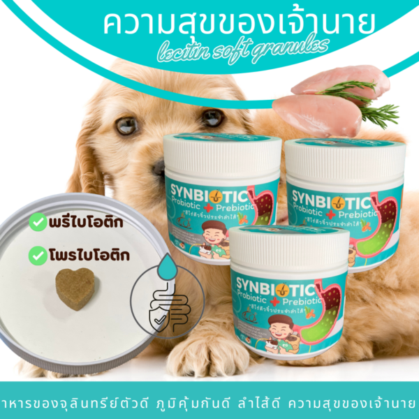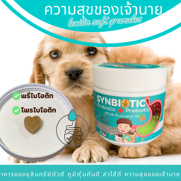ซินไบโอติก เม็ดขนมรูปหัวใจ ที่ใส่ความห่วงใยใส่ใจลงไปด้วยสิ่งที่จำเป็นและพรีไบโอติก ดีต่อลำไส้ น้องๆ จะ ร่าเริง สดใส ไม่ซึม และช่วยลำไส้ เหมาะสำหรับสัตว์เลี้ยง เช่น สุนัข และ แมว