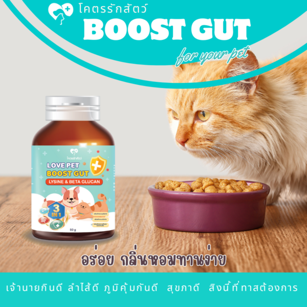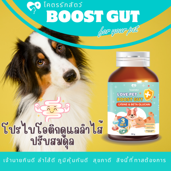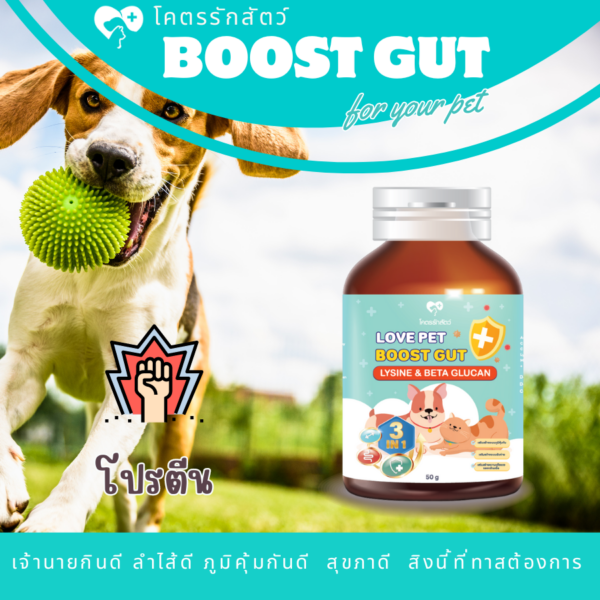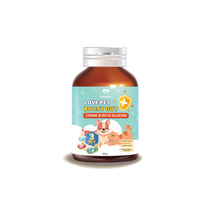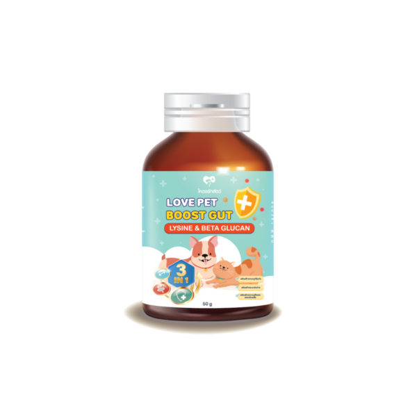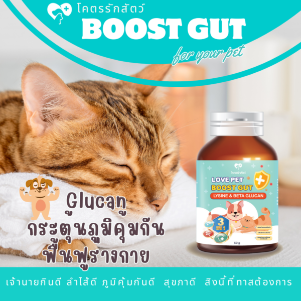 Love pet Boost Gut ผงโปรตีนโรยข้าว 3 in 1 ไลซีน เบต้ากลูแคน โพรไบโอติก สำหรับสัตว์เลี้ยง